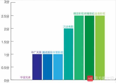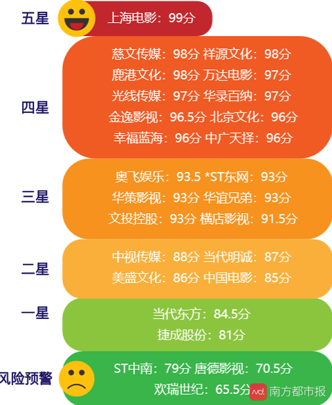 统计结果显示,A股26家影视动漫公司平均得分为90.46分,得分最高的是上海电影,为99分,属于五星级公司;得分区间在95至98分的公司共有10家,属于四星级公司;得分在90至94分的公司共有6家,属于三星级公司;得分在85至89分的公司有4家,为二星级公司;得分在80至84分的公司有2家,为一星级公司;得分在80分以下的公司有3家,分别为ST中南、唐德影视和欢瑞世纪,为“风险预警公司”。