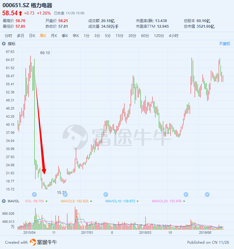 建立好自己的投资组合后,不要被企业的暂时困难吓到,不要被宏观经济暂时的困难吓到,特别是不能被公司短期股价下跌吓到而仓皇出逃。举例来看,格力电器2015年曾股价腰斩,如果在股价下跌30%后斩仓出局,一开始会庆幸自己躲过了接下来20%的下跌,但是3年多之后5倍的涨幅也几乎注定与你无缘了。